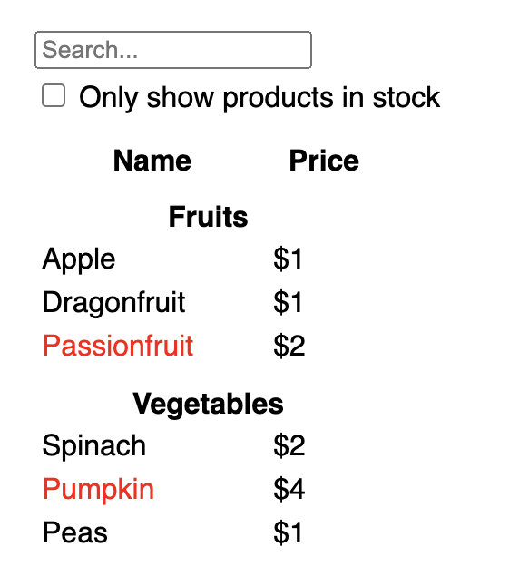 </div>你可以查看你应用程序的表现。在下面的沙盒代码中,通过修改 useState('') 为 useState('fruit') 以编辑 filterText 的初始值,你将会发现搜索输入框和表格发生更新: